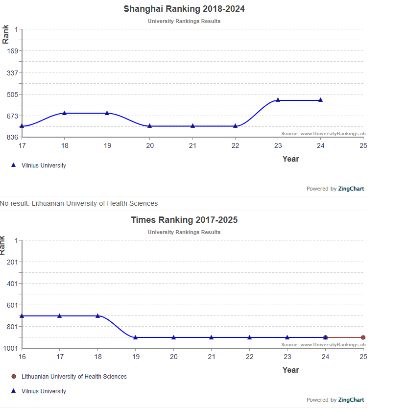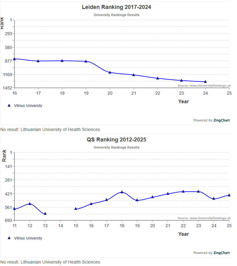- QS World University Rankings: VU stabiliai patenka į 400–800 geriausių universitetų sąrašą, o LSMU šiame reitinge nėra.